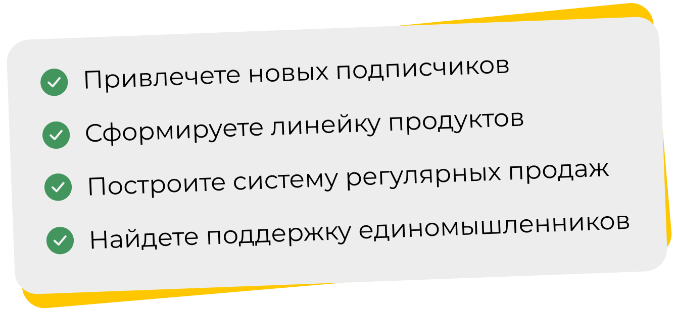 Можно прийти с любым запросом на тему выбора ниши, создания продукта, ведения блога, продвижения, продаж, запусков и тд и получить пошаговую стратегию решения. Бережно и эффективно